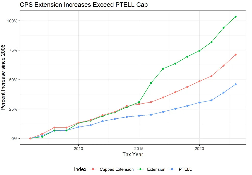 But if those board votes were the only source of CPS property tax growth, Chicagoans should have expected property taxes for schools to increase by around 50% from 2006-2023.