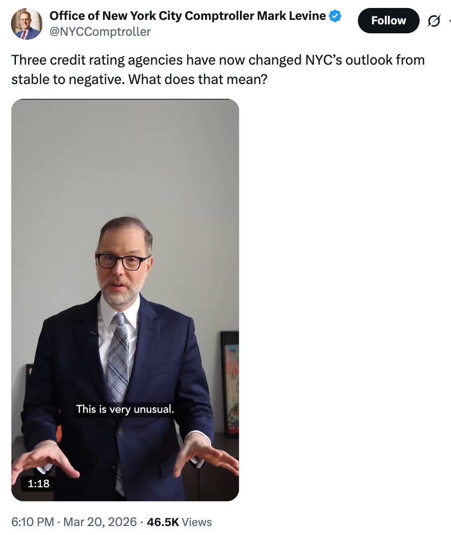 Now watch how New York City’s independently elected comptroller, Mark Levine, reacted to a change in his city’s credit outlook last week (this is an action short of a downgrade that signals a future downgrade is more likely.)
