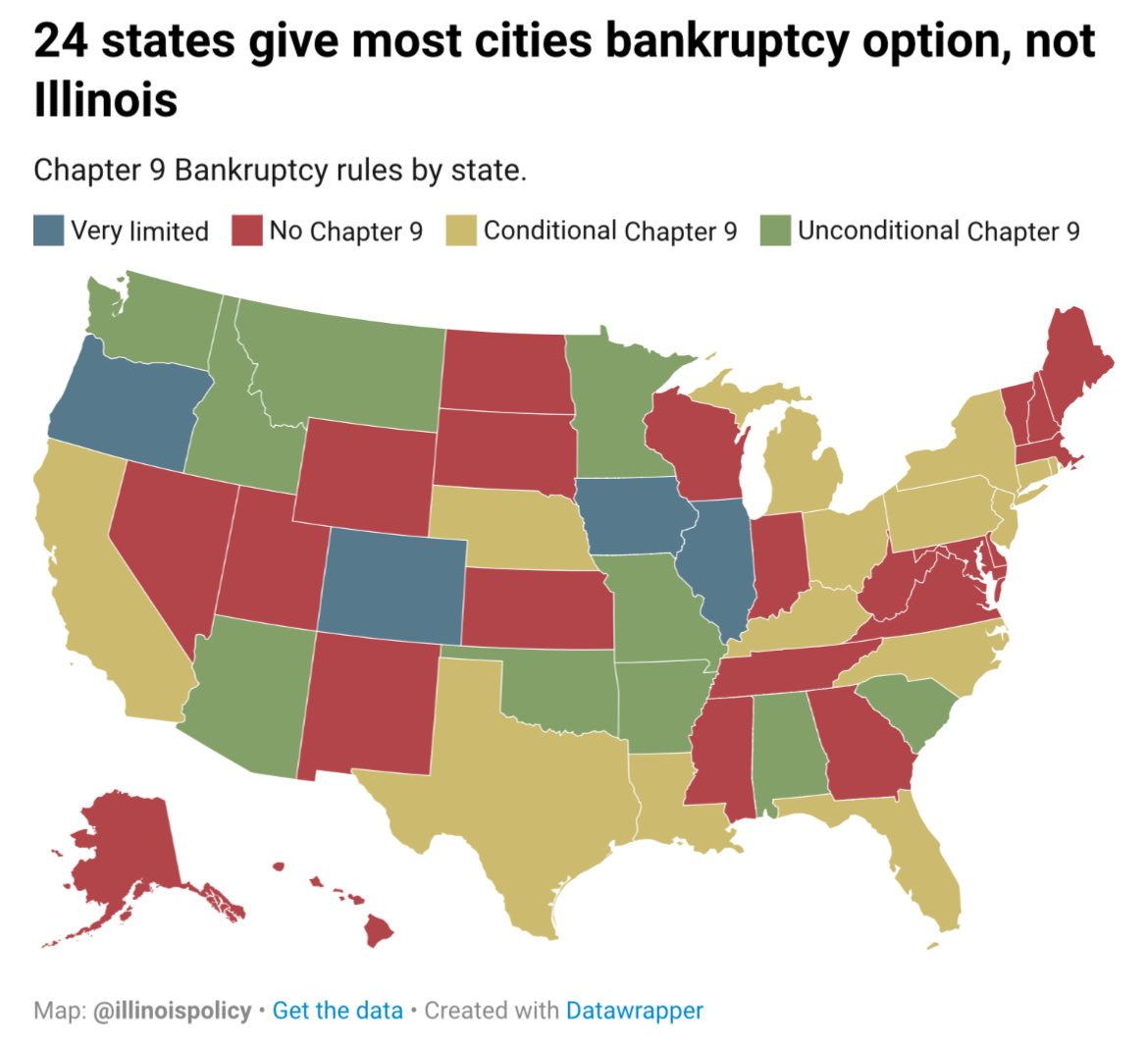 Chapter 9 is a last-resort tool. It’s a way for insolvent governments to restructure debt, renegotiate obligations, and protect essential services for residents. But unlike 24 other states, including California and New York, Illinois doesn’t allow for it.