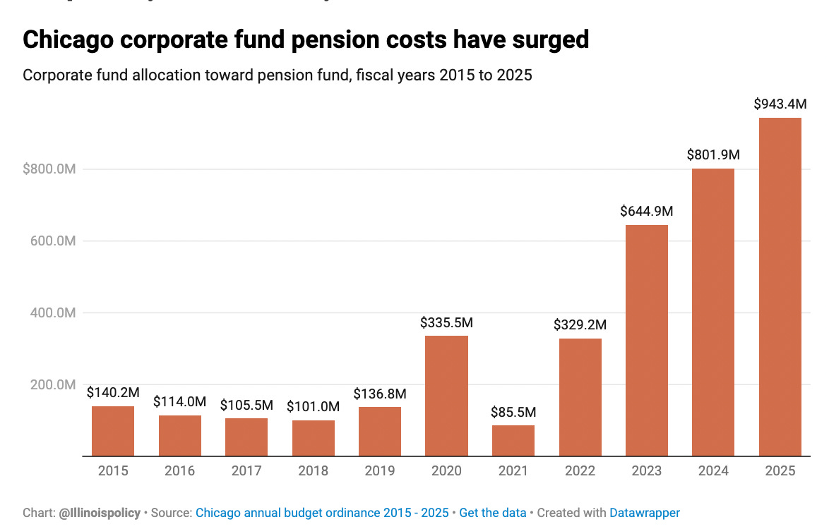 The city’s annual budget crises are fueled by unsustainable pension costs. Just take a look at pension payments out of the corporate fund over the last decade.