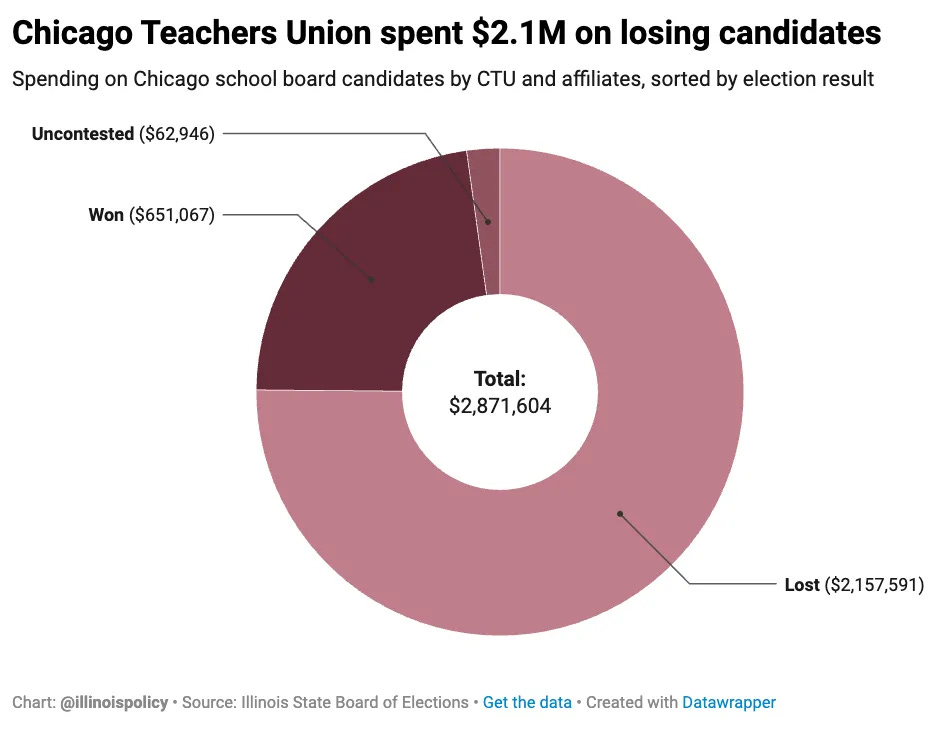 Six of 9 CTU-backed candidates lost their elections for Chicago Board of Education. The union spent $2.1 million on losing candidates, according to a Chicago Policy Center analysis.